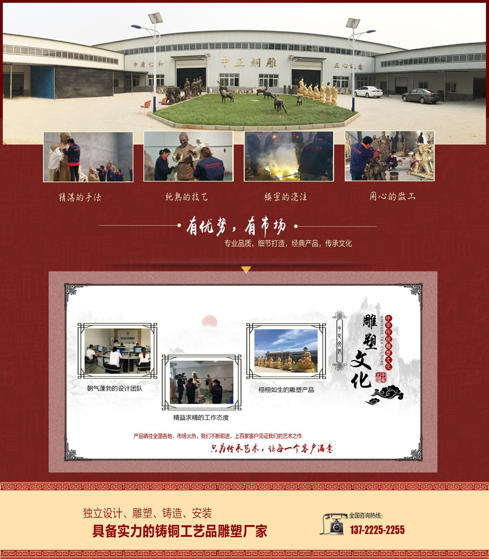 唐縣中正鑄銅雕塑制作生產(chǎn)廠家是一家具有獨立設計、雕塑、鑄造、制作施工能力的單位。擁有完善的,大型的,先進的生產(chǎn)設備,并由多位經(jīng)驗豐富的高級鑄造技師指導生產(chǎn)及制作。公司主要鑄造人物雕塑、動物銅雕、城市雕塑、銅佛像、銅獅子、鑄銅鼎、銅鐘等銅工藝品,可按客戶提供銅雕圖片訂做加工,銅雕塑做工精美,質量有保證。